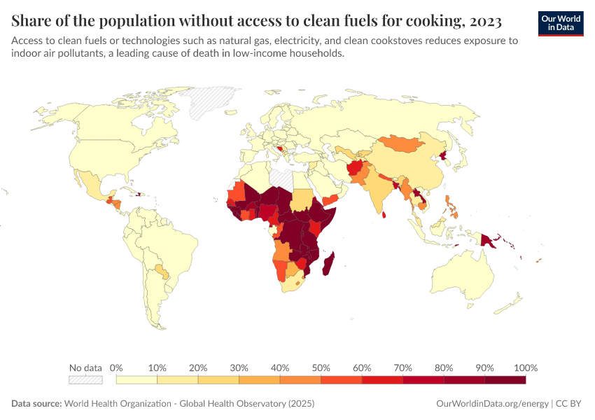World Health Organization - Global Health Observatory (2025) – processed by Our World in Data. “Share of the population without access to clean fuels for cooking” [dataset]. World Health Organization, “Global Health Observatory” [original data]. Retrieved April 11, 2026 from https://bespoke-viz-urb.owid.pages.dev:8789/20260304-094028/grapher/share-of-the-population-without-access-to-clean-fuels-for-cooking.html (archived on March 4, 2026).Download