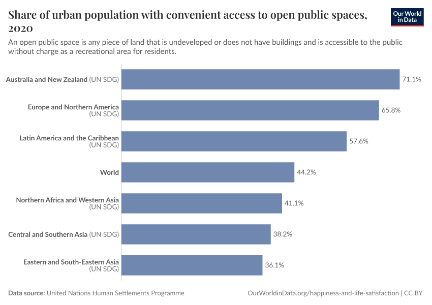 “Data Page: Share of urban population with convenient access to open public spaces”. Our World in Data (2026). Data adapted from United Nations Human Settlements Programme. Retrieved from https://bespoke-viz-urb.owid.pages.dev:8789/20260304-094028/grapher/share-of-urban-population-with-convenient-access-to-open-public-spaces.html [online resource] (archived on March 4, 2026).How to cite this data