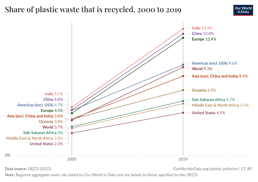 OECD (2023) – processed by Our World in Data. “Share of plastic waste that is recycled” [dataset]. OECD, “Global Plastics Outlook - Plastics waste by region and end-of-life fate” [original data]. Retrieved April 11, 2026 from https://bespoke-viz-urb.owid.pages.dev:8789/20260304-094028/grapher/share-plastic-waste-recycled.html (archived on March 4, 2026).Download