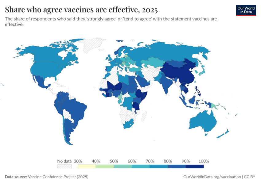 Vaccine Confidence Project (2025) – processed by Our World in Data. “Share who agree vaccines are effective” [dataset]. Vaccine Confidence Project, “Vaccine Confidence Index” [original data]. Retrieved April 11, 2026 from https://bespoke-viz-urb.owid.pages.dev:8789/20260304-094028/grapher/share-who-agree-vaccines-are-effective.html (archived on March 4, 2026).Download