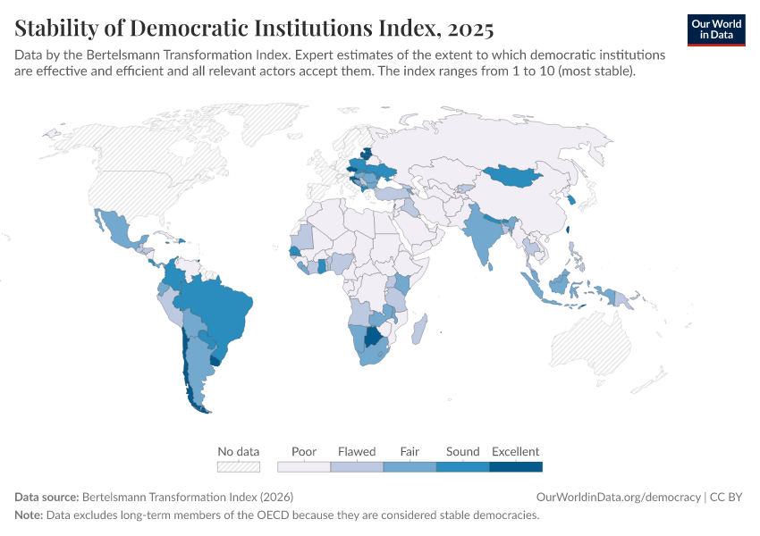 Bertelsmann Transformation Index (2026) – processed by Our World in Data. “Stability of Democratic Institutions Index” [dataset]. Bertelsmann Transformation Index, “Bertelsmann Transformation Index, Scores” [original data]. Retrieved April 11, 2026 from https://bespoke-viz-urb.owid.pages.dev:8789/20260327-184752/grapher/stability-democratic-institutions-index-bti.html (archived on March 27, 2026).Download