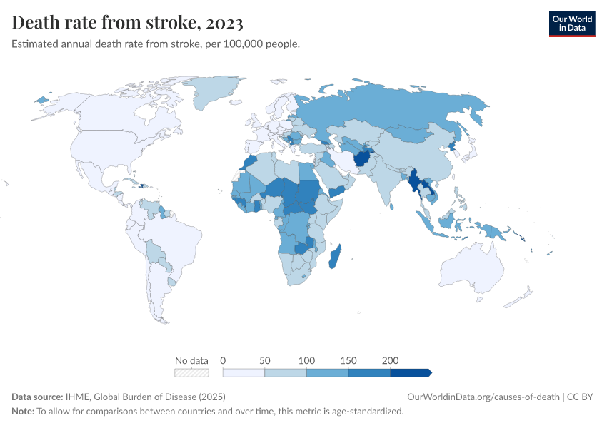 IHME, Global Burden of Disease (2025) – with major processing by Our World in Data. “Death rate from stroke – IHME” [dataset]. IHME, Global Burden of Disease, “Global Burden of Disease - Deaths” [original data]. Retrieved April 11, 2026 from https://bespoke-viz-urb.owid.pages.dev:8789/20260323-161325/grapher/stroke-death-rates.html (archived on March 23, 2026).