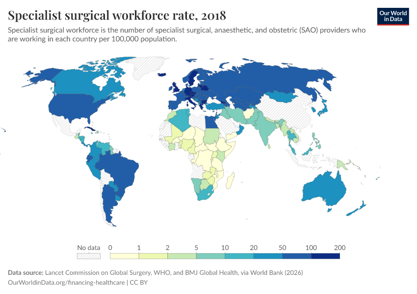 “Data Page: Specialist surgical workforce rate”. Our World in Data (2026). Data adapted from Lancet Commission on Global Surgery, WHO, and BMJ Global Health, via World Bank. Retrieved from https://bespoke-viz-urb.owid.pages.dev:8789/20260304-094028/grapher/surgeons-per-100000.html [online resource] (archived on March 4, 2026).How to cite this data