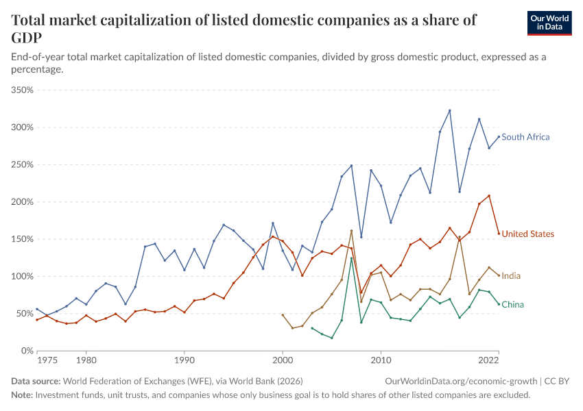 “Data Page: Total market capitalization of listed domestic companies as a share of GDP”. Our World in Data (2026). Data adapted from World Federation of Exchanges (WFE), via World Bank. Retrieved from https://bespoke-viz-urb.owid.pages.dev:8789/20260304-094028/grapher/total-market-capitalization-listed-domestic-companies-share-gdp.html [online resource] (archived on March 4, 2026).How to cite this data