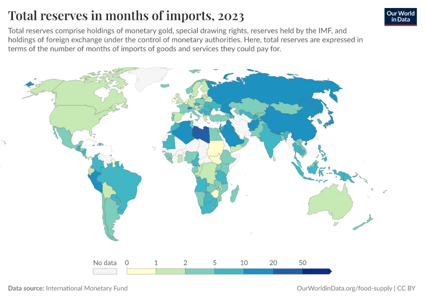 “Data Page: Total reserves in months of imports”. Our World in Data (2026). Data adapted from International Monetary Fund. Retrieved from https://bespoke-viz-urb.owid.pages.dev:8789/20260304-094028/grapher/total-reserves-in-months-of-imports.html [online resource] (archived on March 4, 2026).How to cite this data