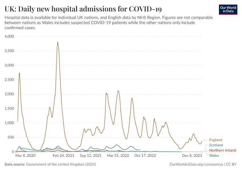 Government of the United Kingdom (2024) – with minor processing by Our World in Data. “UK: Daily new hospital admissions for COVID-19” [dataset]. Government of the United Kingdom, “UKHSA data dashboard” [original data]. Retrieved April 11, 2026 from https://bespoke-viz-urb.owid.pages.dev:8789/20260304-094028/grapher/uk-daily-covid-admissions.html (archived on March 4, 2026).Download