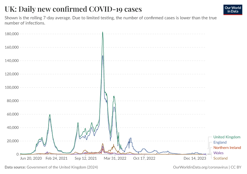 Government of the United Kingdom (2024) – with minor processing by Our World in Data. “UK: Daily new confirmed COVID-19 cases” [dataset]. Government of the United Kingdom, “UKHSA data dashboard” [original data]. Retrieved April 11, 2026 from https://bespoke-viz-urb.owid.pages.dev:8789/20260304-094028/grapher/uk-daily-new-covid-cases.html (archived on March 4, 2026).Download