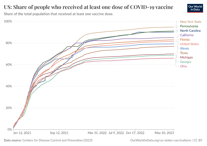 Centers for Disease Control and Prevention (2023) – processed by Our World in Data. “US: Share of people who received at least one dose of COVID-19 vaccine” [dataset]. Centers for Disease Control and Prevention, “COVID-19, Vaccinations (United States)” [original data]. Retrieved April 11, 2026 from https://bespoke-viz-urb.owid.pages.dev:8789/20260304-094028/grapher/us-covid-19-share-people-vaccinated.html (archived on March 4, 2026).Download