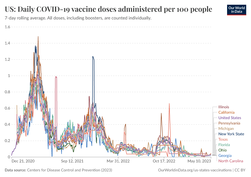 Centers for Disease Control and Prevention (2023) – processed by Our World in Data. “US: Daily COVID-19 vaccine doses administered per 100 people” [dataset]. Centers for Disease Control and Prevention, “COVID-19, Vaccinations (United States)” [original data]. Retrieved April 11, 2026 from https://bespoke-viz-urb.owid.pages.dev:8789/20260304-094028/grapher/us-daily-covid-vaccine-doses-per-100.html (archived on March 4, 2026).Download