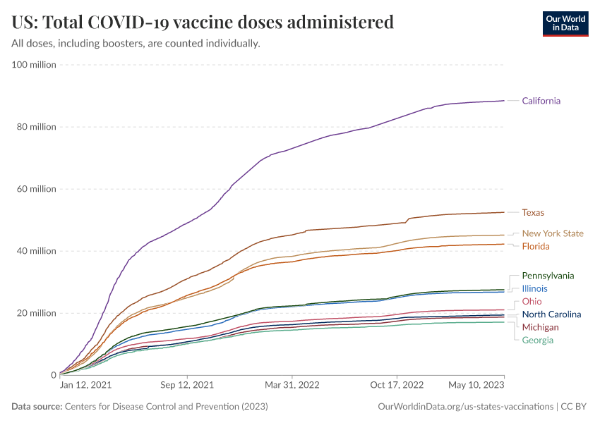 Centers for Disease Control and Prevention (2023) – processed by Our World in Data. “US: Total COVID-19 vaccine doses administered” [dataset]. Centers for Disease Control and Prevention, “COVID-19, Vaccinations (United States)” [original data]. Retrieved April 11, 2026 from https://bespoke-viz-urb.owid.pages.dev:8789/20260304-094028/grapher/us-total-covid-19-vaccine-doses-administered.html (archived on March 4, 2026).Download