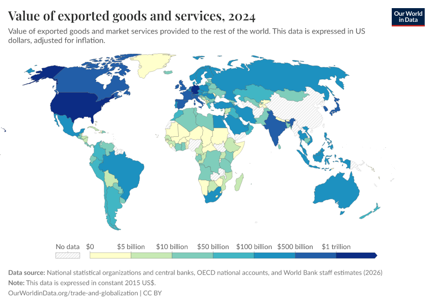 “Data Page: Value of exported goods and services”. Our World in Data (2026). Data adapted from National statistical organizations and central banks, OECD national accounts, and World Bank staff estimates. Retrieved from https://bespoke-viz-urb.owid.pages.dev:8789/20260304-094028/grapher/value-of-exported-goods-and-services.html [online resource] (archived on March 4, 2026).How to cite this data