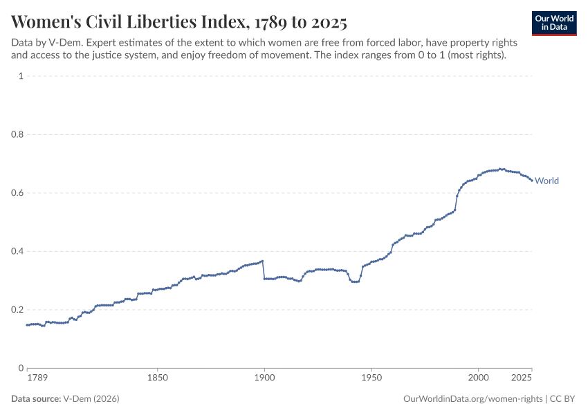 V-Dem (2026) – processed by Our World in Data. “Women's civil rights index – V-Dem” [dataset]. V-Dem, “Democracy report v16” [original data]. Retrieved April 11, 2026 from https://bespoke-viz-urb.owid.pages.dev:8789/20260325-171315/grapher/women-civil-liberties-index.html (archived on March 25, 2026).