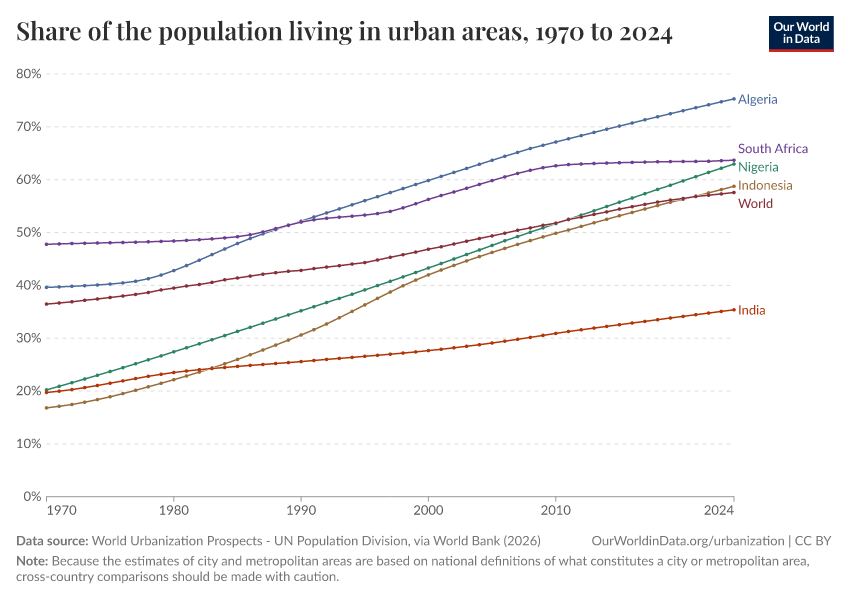 More and more people are moving to cities, particularly in some of the world's hottest and most vulnerable parts. As the chart shows, urban populations are growing rapidly in many countries across the hotter parts of the planet. Finding effective ways to keep cities cool is crucial to protect billions from extreme heat.