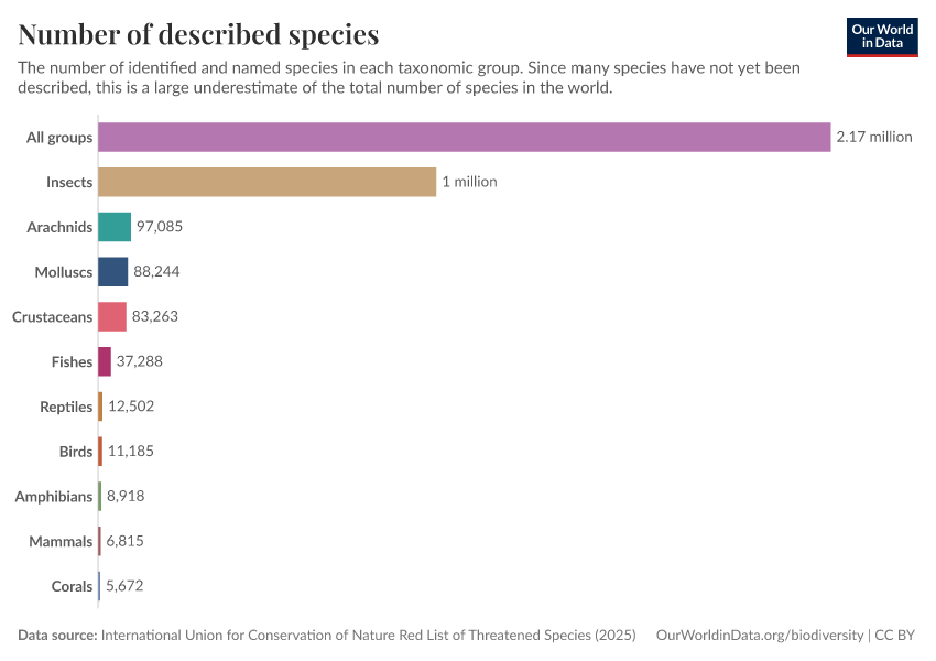 Hannah Ritchie (2022) - “How many species are there?” Published online at OurWorldinData.org. Retrieved from: 'https://bespoke-viz-urb.owid.pages.dev:8789/20260304-094028/how-many-species-are-there.html' [Online Resource] (archived on March 4, 2026).BibTeX citation