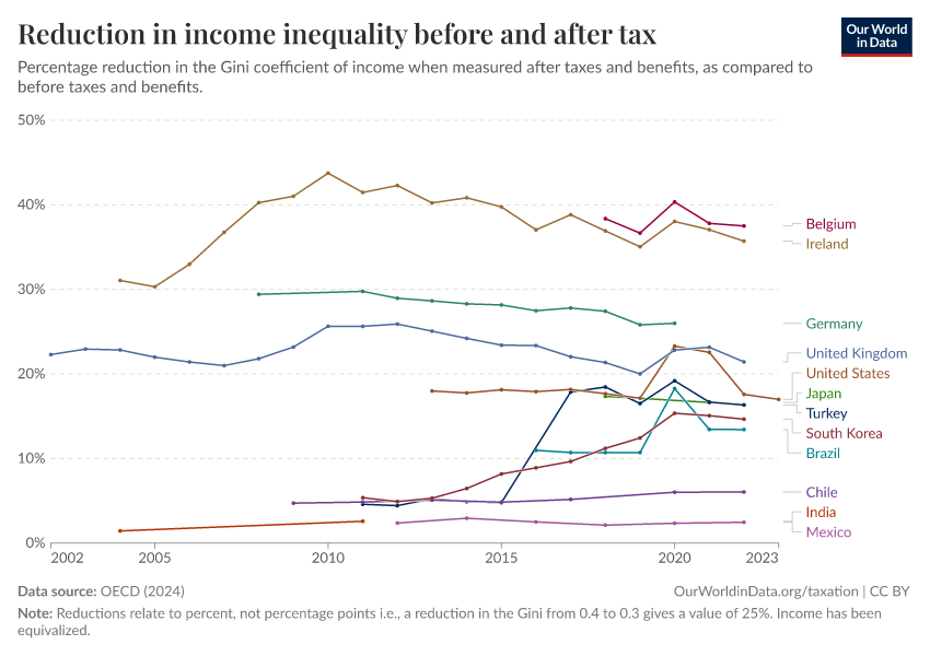 Joe Hasell (2023) - “Income inequality before and after taxes: how much do countries redistribute income?” Published online at OurWorldinData.org. Retrieved from: 'https://bespoke-viz-urb.owid.pages.dev:8789/20260325-171315/income-inequality-before-and-after-taxes.html' [Online Resource] (archived on March 25, 2026).BibTeX citation