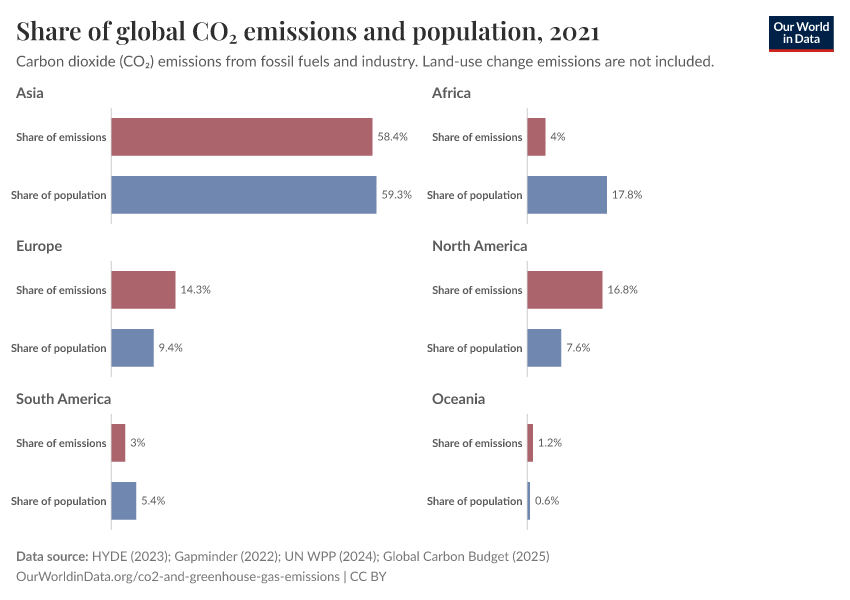 Europe, North America and Oceania all emit more than their ‘fair share’ based on population, whereas Africa and South America emit less.