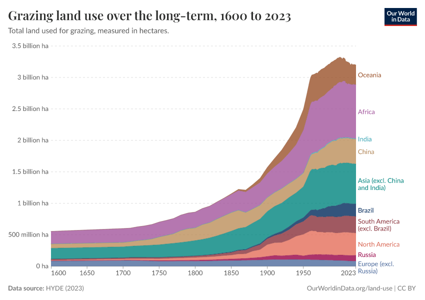 This visualization shows the total land used for agriculture (which is a combination of cropland and grazing land) over the long term, measured in hectares. In the following sections, you can find disaggregated data on cropland and grazing land change over time.