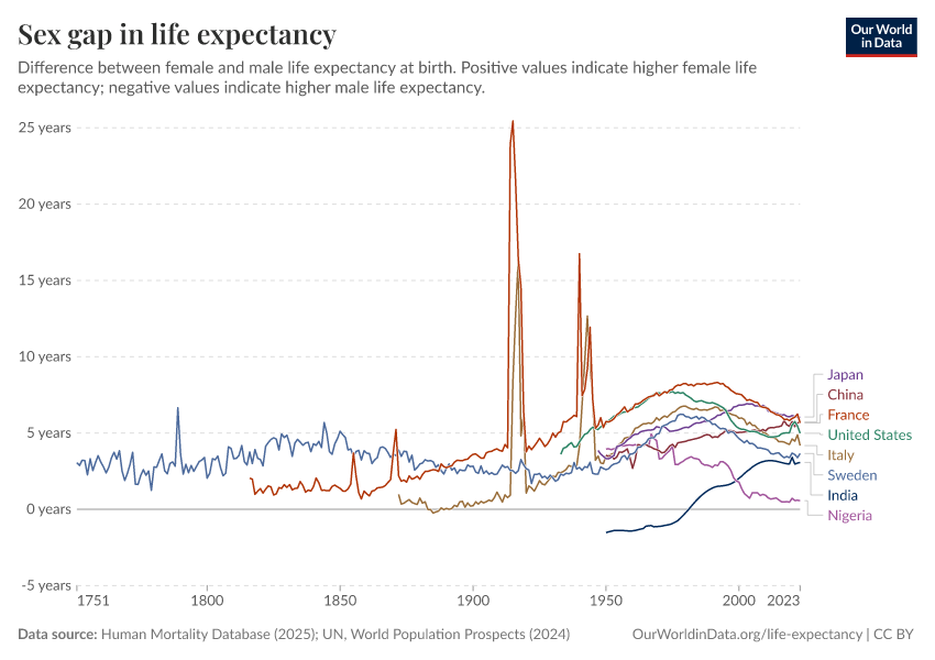 Zarulli, V., Kashnitsky, I., & Vaupel, J. W. (2021). Death rates at specific life stages mold the sex gap in life expectancy. Proceedings of the National Academy of Sciences, 118(20), e2010588118. https://doi.org/10.1073/pnas.2010588118