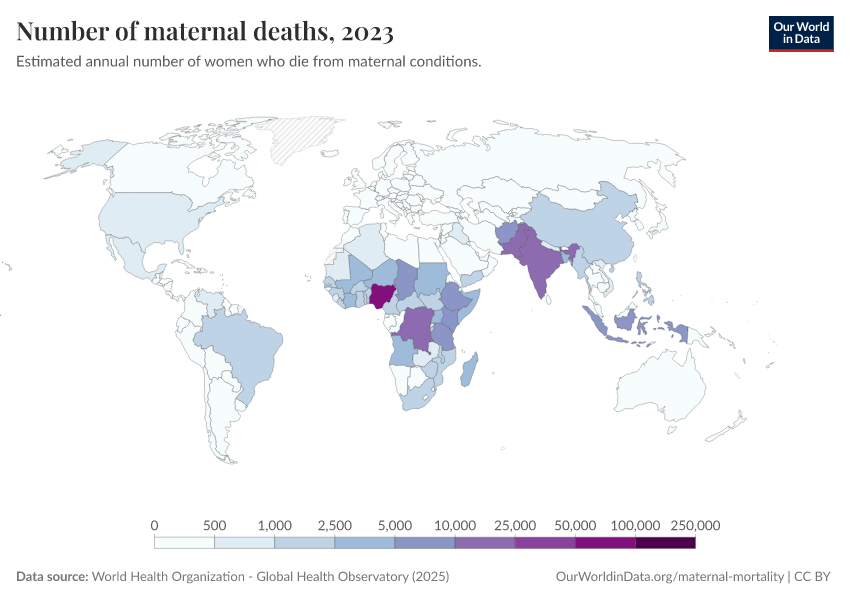 In the map, we see the annual number of pregnancy-related deaths by country. Again, this is a reflection of both the number of births each year and the risk that a mother will die as a result.