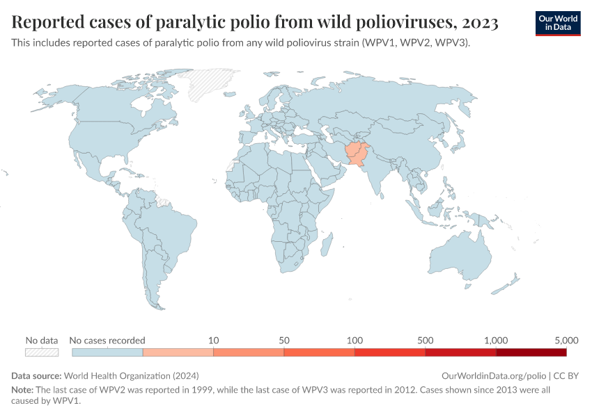 But as the chart shows, the number of cases is now very low. In 2023, only six cases of wild polio were reported in Afghanistan and another six in Pakistan.