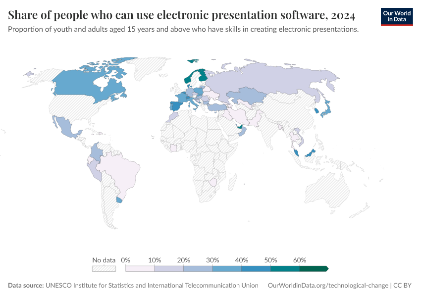 Data for one component of the indicator is shown in the interactive visualizations. The first chart shows the share of youth and adults (aged 15-24 years old) in each country with skills in creating electronic presentations with presentation software. The second chart shows this measure by sex.