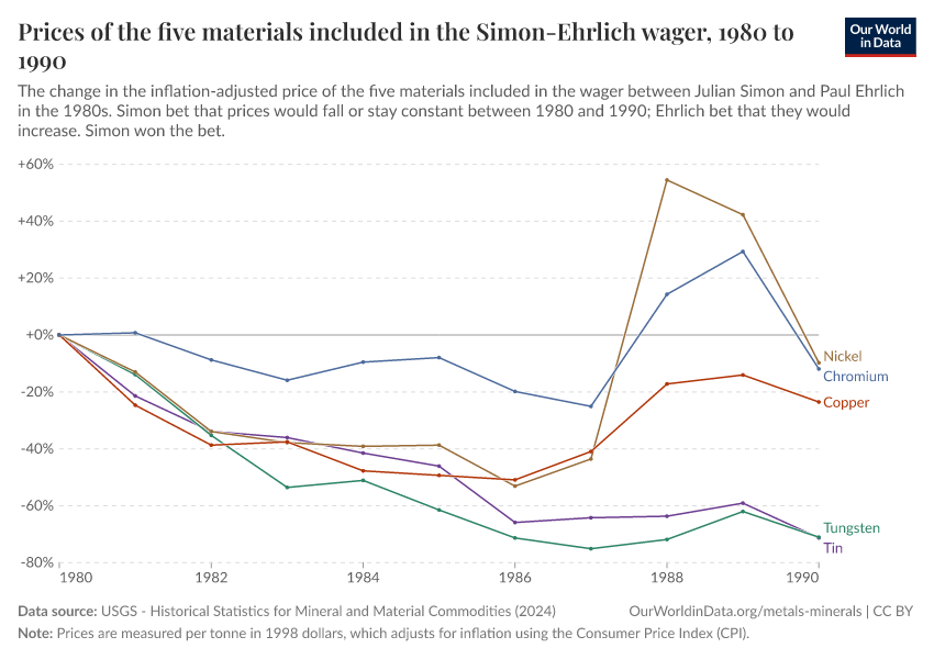 Hannah Ritchie (2025) - “Who would have won the Simon-Ehrlich bet over different decades, and what do long-term prices tell us about resource scarcity?” Published online at OurWorldinData.org. Retrieved from: 'https://bespoke-viz-urb.owid.pages.dev:8789/20260304-094028/simon-ehrlich-bet.html' [Online Resource] (archived on March 4, 2026).BibTeX citation