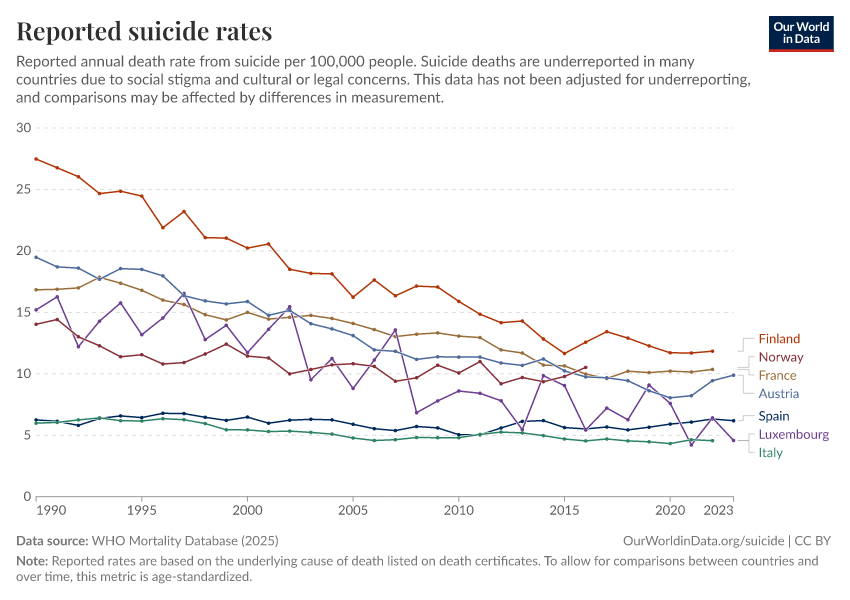 Saloni Dattani, Lucas Rodés-Guirao, Hannah Ritchie, Max Roser, and Esteban Ortiz-Ospina (2023) - “Suicides” Published online at OurWorldinData.org. Retrieved from: 'https://bespoke-viz-urb.owid.pages.dev/suicide' [Online Resource]BibTeX citation