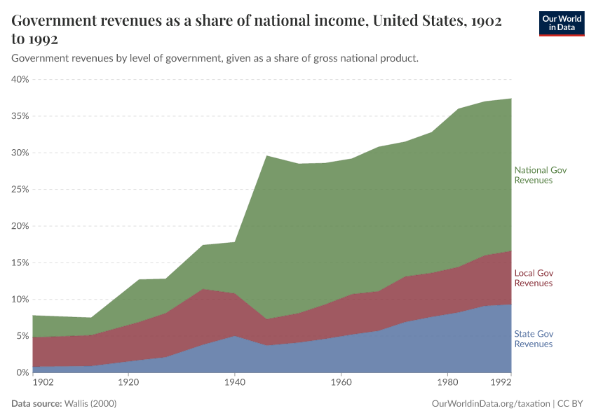 The visualization shows how this transition took place. It provides details regarding the evolution of government revenues by level of government, expressed as a share of national income.