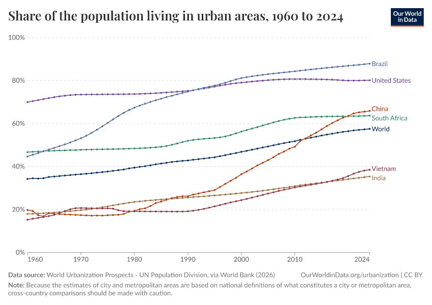 Hannah Ritchie, Veronika Samborska, and Max Roser (2024) - “Urbanization” Published online at OurWorldinData.org. Retrieved from: 'https://bespoke-viz-urb.owid.pages.dev/urbanization' [Online Resource]BibTeX citation