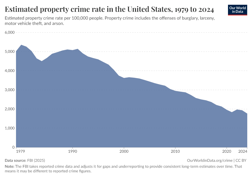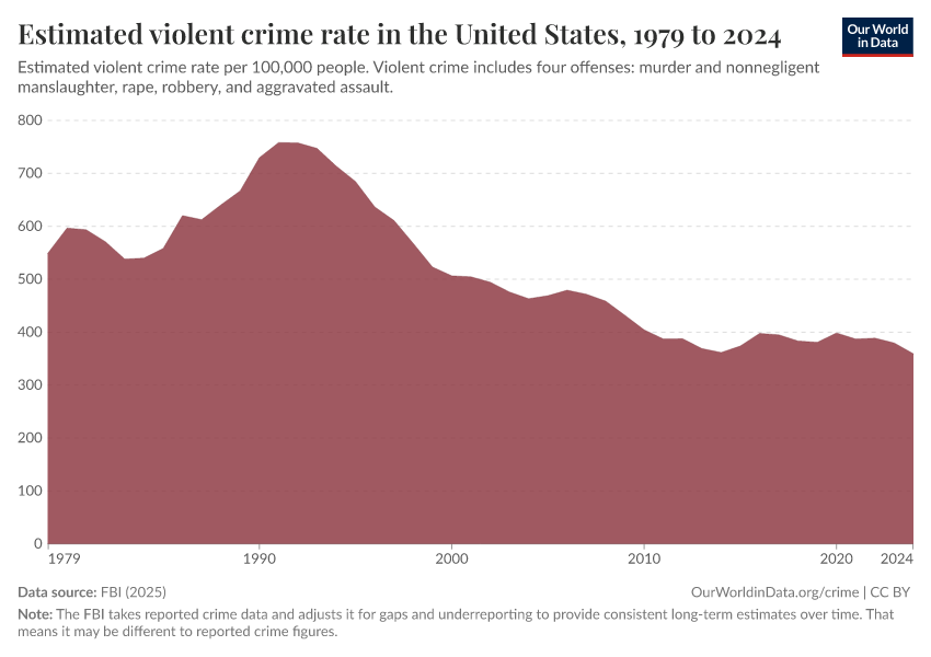 Hannah Ritchie and Fiona Spooner (2026) - “How have crime rates in the United States changed over the last 50 years?” Published online at OurWorldinData.org. Retrieved from: 'https://bespoke-viz-urb.owid.pages.dev:8789/20260304-094028/us-crime-rates.html' [Online Resource] (archived on March 4, 2026).BibTeX citation