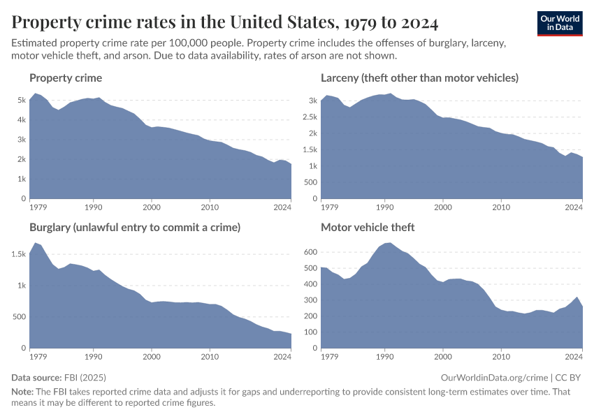 Both violent and property crime are far below their 1990s peak, but some crimes see periodic rises.