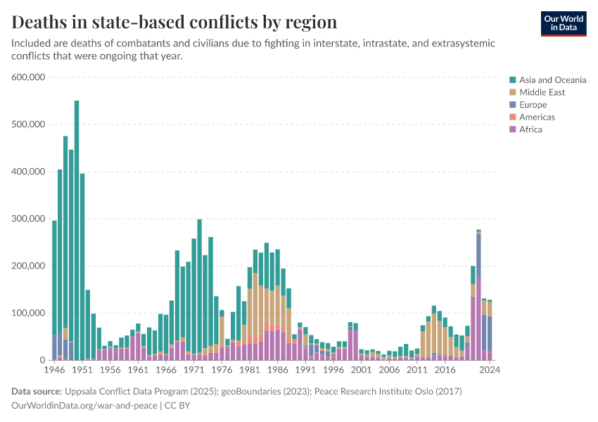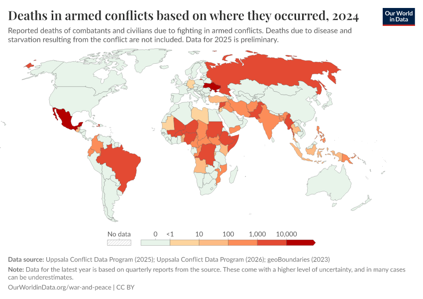 Bastian Herre, Lucas Rodés-Guirao, and Max Roser (2024) - “War and Peace” Published online at OurWorldinData.org. Retrieved from: 'https://bespoke-viz-urb.owid.pages.dev/war-and-peace' [Online Resource]BibTeX citation