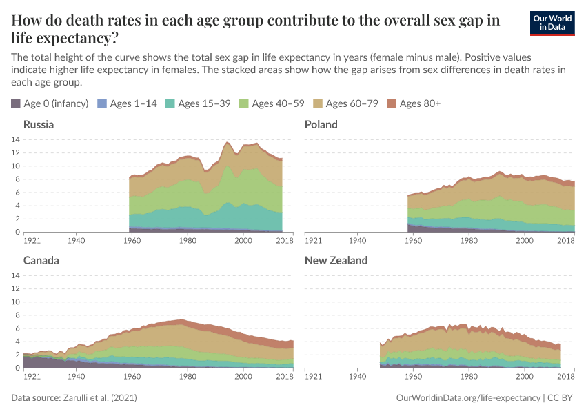 The chart below shows that there are also differences between countries. In Russia and Poland, for example, the overall sex gap in life expectancy is still large due to higher death rates in young and middle-aged men than women.