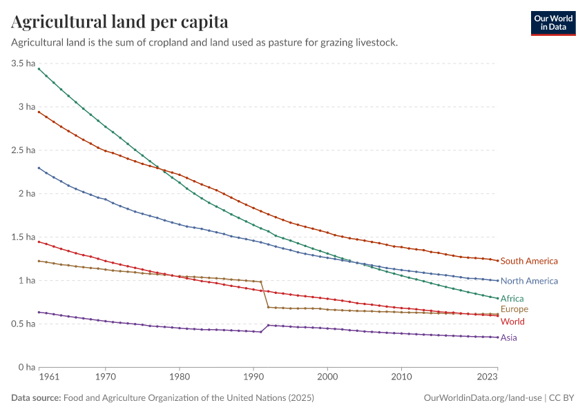 The world passed ‘peaked deforestation’ in the 1980s and it has been on the decline since then – we take a look at rates of forest loss since 1700 in our follow-up post. Improvements in crop yields mean the per capita demand for agricultural land continues to fall. We see this in the chart. Since 1961, the amount of land we use for agriculture increased by only 7%. Meanwhile, the global population increased by 147% – from 3.1 to 7.6 billion.3 This means that agricultural land per person more than halved, from 1.45 to 0.63 hectares.