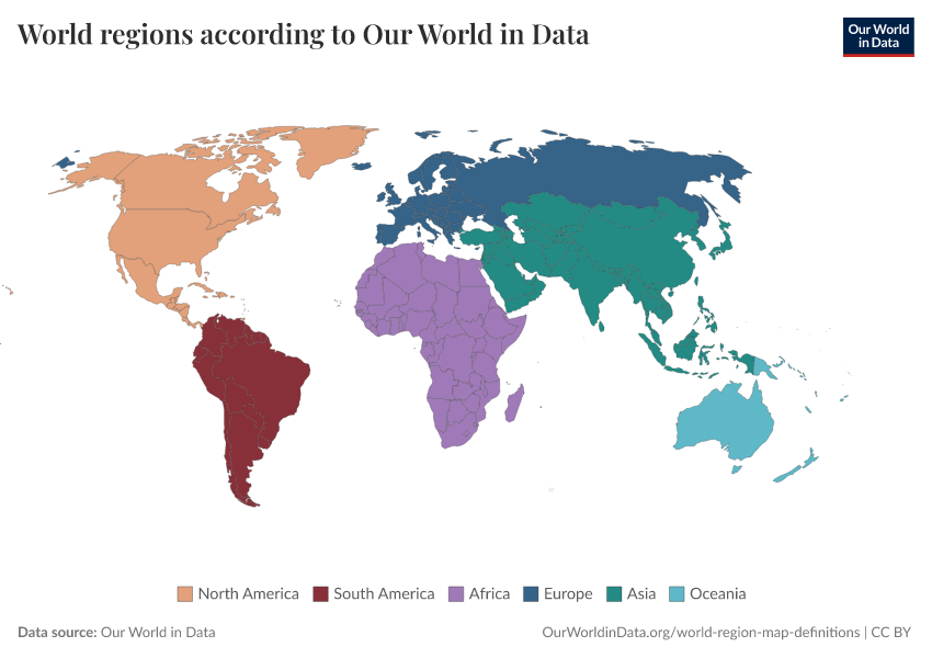 If you’re looking at a chart on Our World in Data and see a region labeled simply as “Asia” or “Europe”, that means it’s using our definitions. If you see a source noted in brackets (e.g., “East Asia and Pacific (WB)”), it’s using that source’s regional scheme.