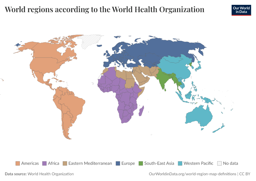 The World Health Organization defines six world regions: Africa, Americas, Eastern Mediterranean, Europe, South-East Asia, and Western Pacific. This map shows how they are defined.