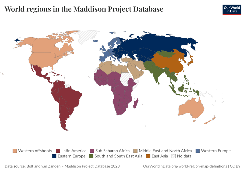 The Maddison Project Database defines eight world regions: East Asia, Eastern Europe, Latin America, Middle East and North Africa, South and South East Asia, Sub-Saharan Africa, Western Europe, and Western offshoots. This map shows how they are defined.