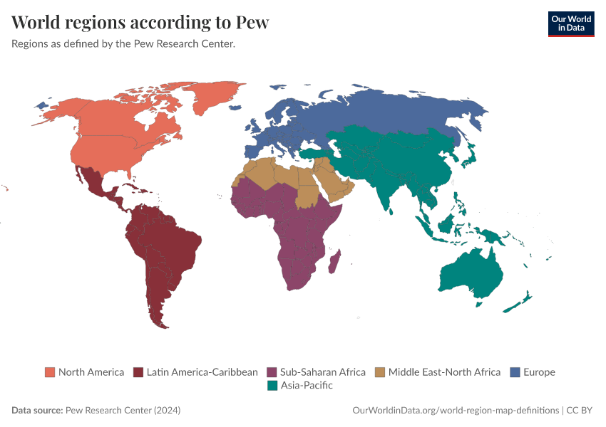 The Pew Research Center defines six world regions: North America, Latin America-Caribbean, Sub-Saharan Africa, Middle East-North Africa, Europa, Asia-Pacific. This map shows how they are defined.