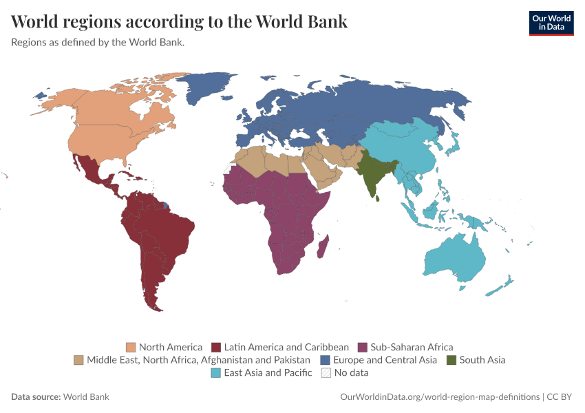 The World Bank defines seven world regions: East Asia and Pacific; Europe and Central Asia; Latin America and Caribbean; Middle East, North Africa, Afghanistan and Pakistan; North America; South Asia; and Sub-Saharan Africa. This map shows how they are defined.