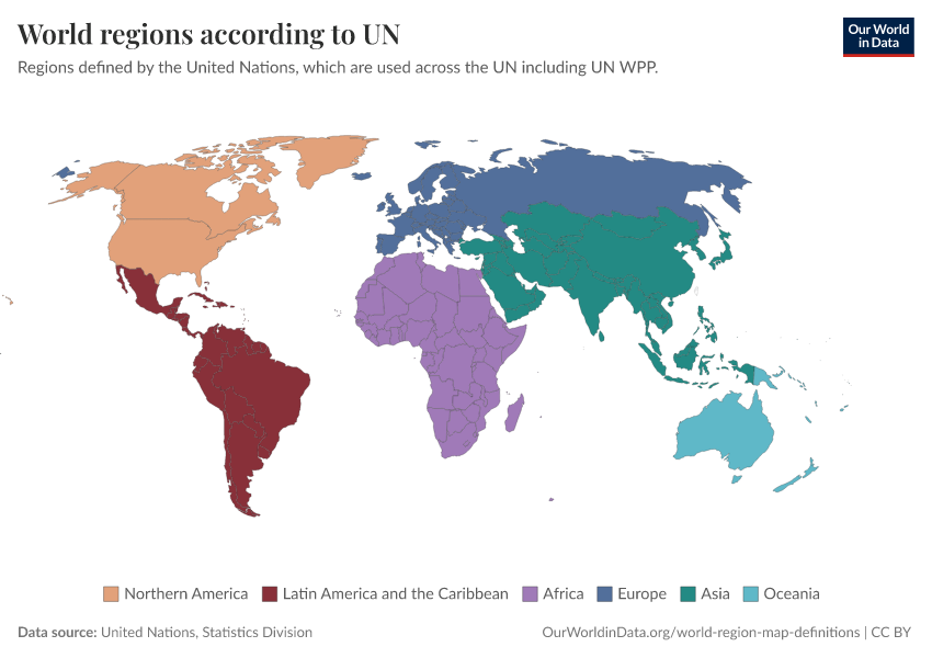 When utilized in charts on our website, these regions will be denoted as “[region] (UN)”; for instance, “Oceania (UN)”.