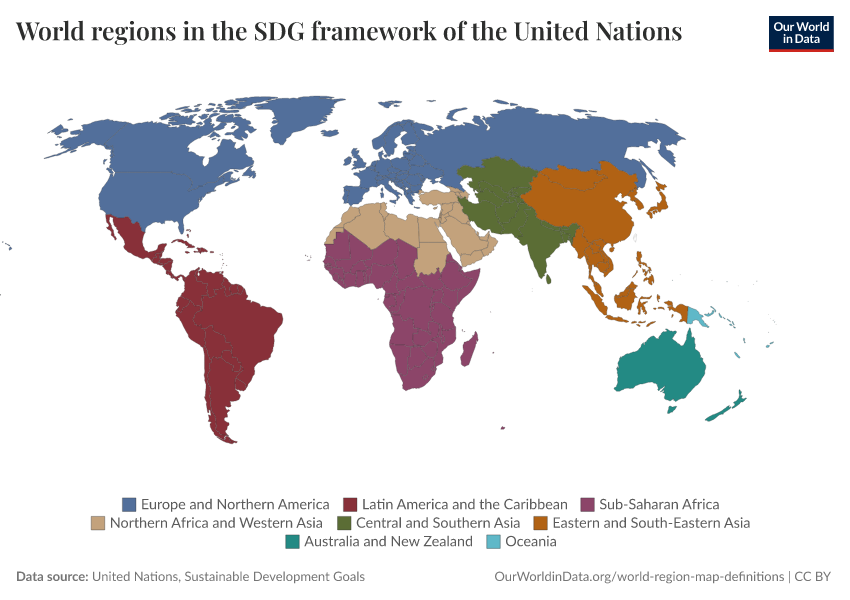 When reporting data on the Sustainable Development Goals, the United Nations defines eight world regions: Australia and New Zealand, Central and Southern Asia, Eastern and South-Eastern Asia, Europe and Northern America, Latin America and the Caribbean, Northern Africa and Western Asia, Oceania, and Sub-Saharan Africa. This map shows how they are defined.