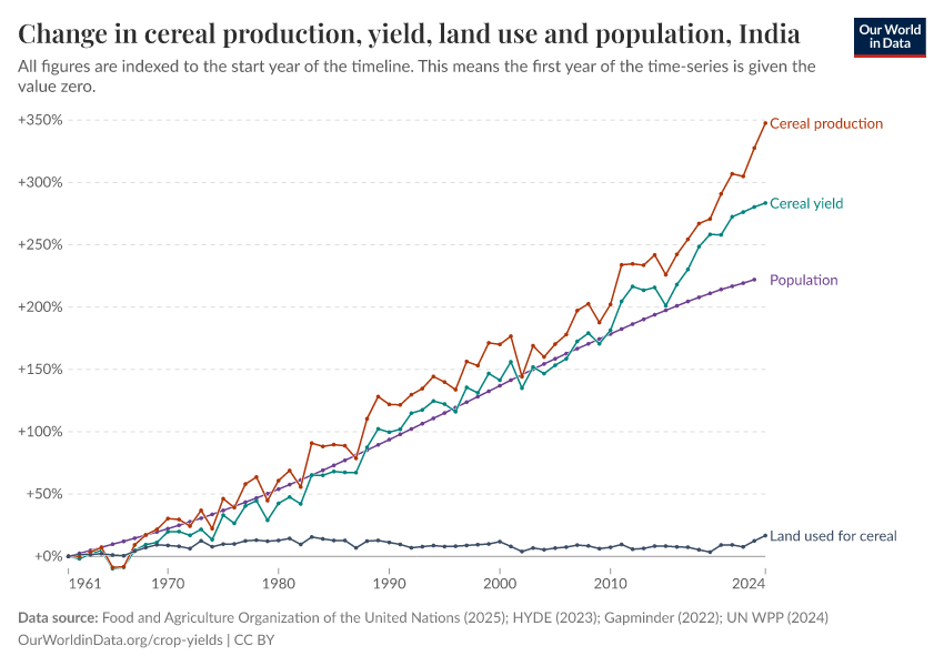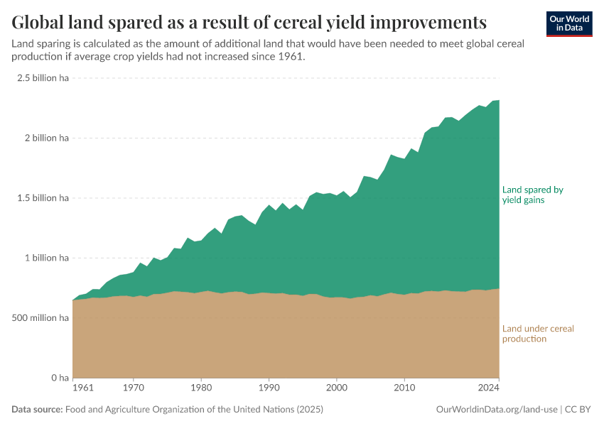 Hannah Ritchie (2017) - “Yields vs. land use: how the Green Revolution enabled us to feed a growing population” Published online at OurWorldinData.org. Retrieved from: 'https://bespoke-viz-urb.owid.pages.dev:8789/20260304-094028/yields-vs-land-use-how-has-the-world-produced-enough-food-for-a-growing-population.html' [Online Resource] (archived on March 4, 2026).BibTeX citation